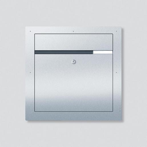 Classic Briefkasten mit frontseitiger Entnahme. Frontseite aus gebürstetem V4A Edelstahl. Das Namensschild befindet sich unter der Einwurfklappe. Bedienungsfreundliche Postentnahmetür, die im vorbestimmten Winkel automatisch abbremst, Sicherheitsschloss mit 2 Schlüssel.