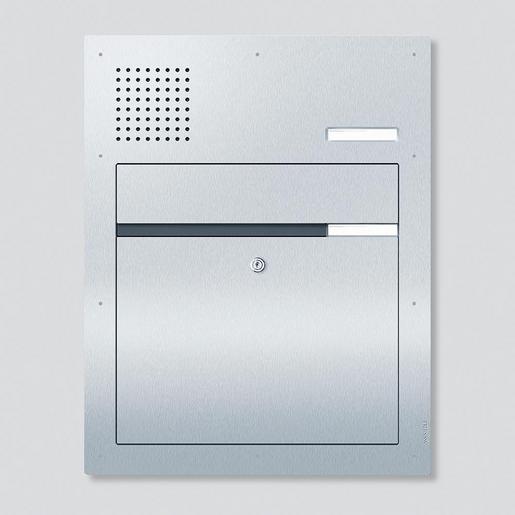 Classic Briefkasten mit frontseitiger Entnahme für den In-Home-Bus. Frontseite aus gebürstetem V4A Edelstahl. Türlautsprecher, 1 Ruftaste. Das Namensschild befindet sich unter der Einwurfklappe. Bedienungsfreundliche Postentnahmetür, die im vorbestimmten Winkel automatisch abbremst, Sicherheitsschloss mit 2 Schlüssel.