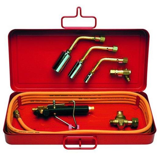 Brennerkasten bestehend aus: Brennerhandgriff FH-1630-S-MC. zwei Brennereinsätze FH-1630-S-BN28 und FH-1630-S-BN38. Lötbrenneinsatz FH-1630-S-PN17. Konstantdruckregler FH-1630-S-R1,Schlauchbruchsicherung FH-1630-PIE-CV. Einwandiger Hochdruckschlauch.
