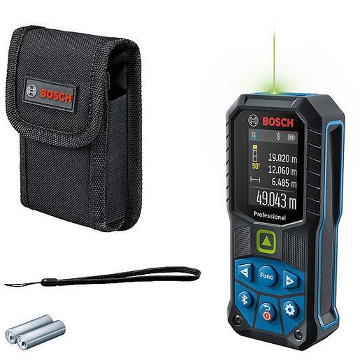 Laser-Entfernungsmesser GLM 50-27 CG, Der Laser-Entfernungsmesser GLM 50-27 CG Professional bietet eine hervorragende Sichtbarkeit des Laserpunkts, ein sehr langlebiges Design und eine schnelle Dokumentation. Da sein grüner Laserpunkt im Vergleich zu einem roten Laserpunkt besser zu sehen ist, eignet er sich besonders zum Messen großer Distanzen bei hellen Innenraumbedingungen. Dank der Kombination aus einem IP 65-zertifizierten Design und einem stoßabsorbierenden Gehäuse mit Gummiummantelung hält es Stürze aus 1,5 Meter Höhe, sogar auf harten Beton und auf rauen Baustellen aus. Bluetooth®-Konnektivität und die Bosch MeasureOn App gewährleisten eine zügige Dokumentation und blitzschnelle Übertragung der Messergebnisse. Dieser Laser-Entfernungsmesser eignet sich optimal zum Dokumentieren, Berechnen des Materialbedarfs, Berechnen von Räumen und Wandflächen und Positionieren von Befestigungselementen, und ist somit ideal für Architekten, Elektriker und viele andere professionelle Anwender. Das Gerät gibt sowohl ein Akustik- als auch Vibrationssignal zur Bestätigung einer erfolgreichen Messung und bietet eine längere Akkulaufzeit (im Vergleich zum Vorgänger GLM 50 C Professional). Schutztasche. Trageschlaufe. 2 x 1,5 V LR6-Batterie (AA)