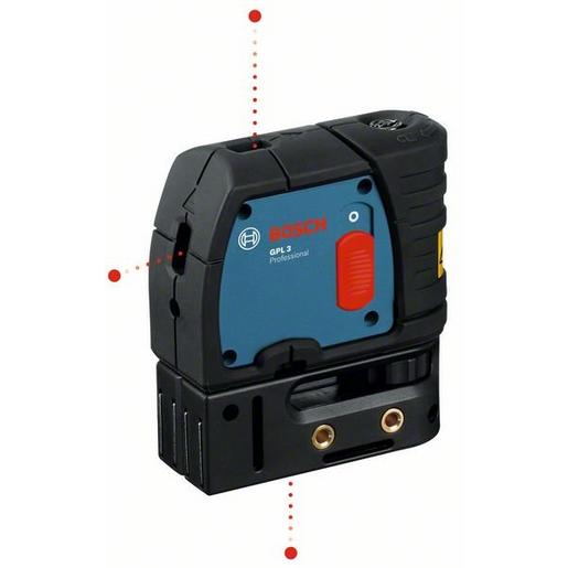 Punktlaser GPL 3. Hochkompakter 3-Punkt-Laser – ideal für Lotpunkt-Übertragung. Selbstnivellierender 3-Punkt-Horizontal- und Lotlaser für das Arbeiten im Innenbereich. Ermöglicht präzises Übertragen eines Referenzpunktes vom Boden an die Decke. Einfache Handhabung durch seine sehr kompakte Größe. Vielfältige Möglichkeiten zur Befestigung mittels Universalhalterung. Arbeitsbereich bis 30 m. Hohe Nivelliergenauigkeit +/- 0,3 mm/m. Staub- und Spritzwasserschutz: IP 5X. Multifunktionshalterung (ET-Nr. 1 618 C00 465), Schutztasche, 3 x 1,5 V-LR6-Batterie (AA).