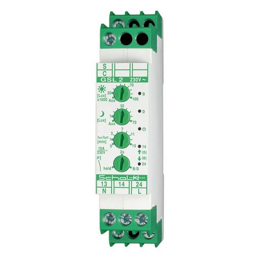 Der GSL 2 ist ein universell einsetzbarer Grenzwertschalter für die Helligkeitsüberwachung. Mit zwei separaten Einstellbereichen von 1-70 Lux bei der Dämmerungsüberwachung und 20.000-100.000 Lux bei der Beschattungsüberwachung können verschiedenste Anwendungen (Steuerung von Beschattungsanlagen, helligkeitsabhängige Rolladen-/Jalousiesteuerung, einfache Lichtsensorauswertung von nachgeschalteten Steuerungen wie SPS, etc.) realisiert werden. Durch 2 Betriebsarten und einen automatisch erzeugten Gegenlaufimpuls ist eine schnelle und einfache Integration in einer Vielzahl von Anlagen gewährleistet. Der passende Lichtsensor SL 2 wird potentialfrei durch den GSL 2 versorgt (3.3V DC PELV), somit wird kein externes Netzteil benötigt., Maße: 18x55mm, 230V AC