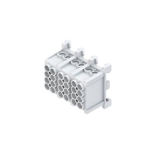 Hauptleitungs-Abzweigklemme 25 mm² nach DIN VDE 0603-2 allseitig fingersicher, mit Schnappbefestigung zur senkrechten und waagerechten Anbringung auf Tragschiene TS 35 mm deren Anschlussmaße DIN EN 60715 entsprechen, halogenfrei. Abmessung (ca. Maße) H x B x L : 37 x 50,5 x 61,5 mm Anschlussmöglichkeiten : 4 Klemmstellen 2,5 mm² bis 25 mm² je Pol Polzahl : 3 Werkstoff Isolierteil : PA Werkstoff Kontakt : Messing Werkstoff Klemmschrauben : galv. verz. Stahl mit Podzidrive-Kombikreuzschlitzkopf Nennspannung : 400 V Farbton : lichtgrau RAL : 7035 (ähnlich)