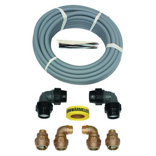 Installationsset für 40 mm bestehend aus: 2 x R 5/4 Anschlussstück PE-Rohr- Außeneinheit 2 x 90 Grad Winkel 40 x 5/4 1 x Leerrohr zur Verlegung des E-Bus Kabels im Erdreich 2 x Messingwinkel 90 Grad, 40 x 5/4 1 x Trassenband und Kabelbinder zur Markierung der PE-Rohre