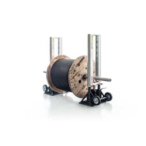 DER KRAFTVOLLE TROMMELHEBER BIS 6 TONNEN.Im Einsatzbereich der großen und schweren Kabeltrommeln bis zu einem Gewicht von 6 Tonnen stellt der JUMBOLIFT eine neue Generation von Trommelhebern dar. Die innovative Technik der soliden Aluminiumkonstruktion ermöglicht es, schwere Trommeln an jedem Ort sicher und leicht abzurollen. Der JUMBOLIFT ist erprobt für den Einsatz auf der Baustelle. Die vollmetallische Ausführung gewährleistet lange Lebensdauer. Völlig wartungsfreie Bauform, auch beim Einsatz im Freien. Die wesentlichen Vorteile sind die gleitgelagerten Rollen des Aufnahmeblocks sowie die Zentrierkonen auf der Trommelachse. Das sichert einen asolut leichten und ruhigen Lauf der Kabeltrommel und reduziert die Kippgefahr des Gesamtsystems. Alle Teile sind gegen Verlieren gesichert. Jeder Trommelheber kommt als Paket bestehend aus zwei Seitenteilen, einer Trommelachse und den dazugehörigen Zentrierkonen.Max. Belastung 6.000 kgMax. Trommel-Ø 2.200 mmMin. Trommel-Ø 700 mmMaße (H x T x B) 1.122 x 440 x 500 mmLänge der Trommelachse 1.850 mmMax. Trommelbreite 1.300 mmGewicht pro Seite 70 kg