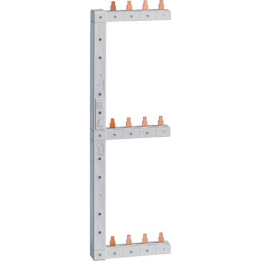 Phasenschiene senkrecht 63A links/rechts (sym.) L1L2L3N zu L1L2L3N 125mm 3-reihi. Senkrechte Phasenschienen zum Verteilen der Haupteinspeisung auf mehrere Hutschienen. Durch kompakte Bauform und optimierte Installationsposition vergrößert sich der Installationsraum besonders für die Installation der Endstromkreise.
