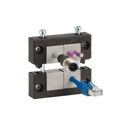 Die dem Leitungsdurchmesser entsprechende KT Kabeltülle wird um die Leitung gelegt und in die Kabeleinführungsleiste eingesetzt. Leitungen von 1 bis 35 mm Durchmesser können eingeführt, abgedichtet und zugleich gemäß DIN EN 62444 zugentlastet werden.
