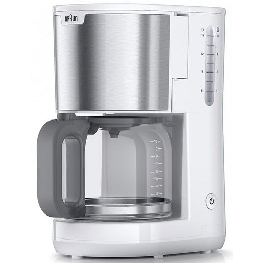10 (15 kleine) Tassen, Optibrew System, Aroma-Karaffe, Braun Tropfstopp, schwenkbarer Filterkorb, Wasserstandsanzeige mit Doppelskala, spülmaschinenfeste Karaffe, weiß/rostfreier Stahl