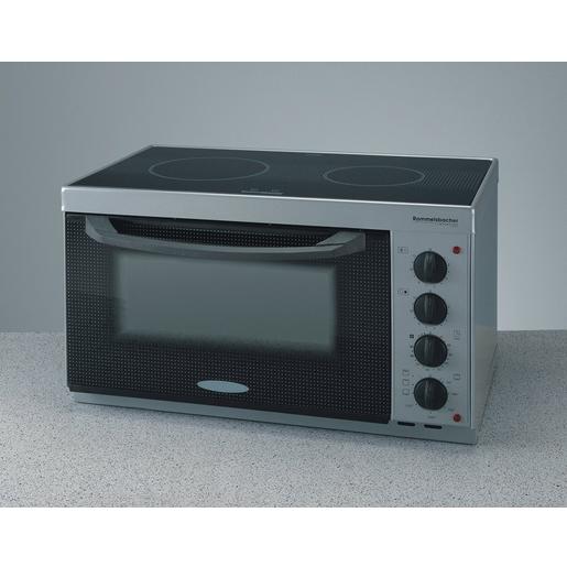 Kleinküche, 230 V ~ 3000 Watt, mit Glaskeramik-Kochfeld, anthrazit, Heizzonen: 145 mm Ø 1200 W / 180 mm Ø 1800 W, Glaskeramik Kochfeld mit 2 Heizzonen und 2 Restwärmeanzeigen, Temperatur stufenlos regelbar über Energie-Regler, 2 Kontrolllampen, Backofen CLEANemail beschichtet, mit Sichtfenster und Innenbeleuchtung, Garraum 22 Liter, Ober- und Unterhitze stufenlos regelbar, Gesamtleistung Backofen 1150 W, Grill 1000 W, Zusatzfunktionen nur Unterhitze, nur Oberhitze, Grill, automatische Backofen- und Grill-Vorrangschaltung, dadurch an jede Steckdose anzuschließen, Tür-Doppelverglasung, Zeitschaltuhr 90 min, geregelte Backraum-Entlüftung, Zubehör: Bratblech emailliert, Grillrost verchromt