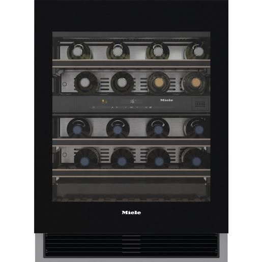 Weinschrank Einbaugerät Einbaugerät integriert Einbaugerät untergebaut Türanschlag: rechts Side-by-Side fähig Türanschlag wechselbar Frontfarbe: Glastür Beleuchtung Kühlzone: LED DynaCool SoftClose Active AirClean Filter Anzahl der Holzroste: 4 Anzahl Holzroste FlexiFrame: 3 Push2open Türöffnungshilfe: Push2open Vibrationsarme Lagerung Bedienkonzept: TouchControl Anzahl Temperaturzonen: 2 Energieverbrauch pro Jahr in kWh: 144 Energieverbrauch in 24 h in kWh: 0,392 Miele@home WiFiConn@ct Verriegelungsfunktion Akustischer Türalarm Akustischer Temperaturalarm Nischenbreite in mm: 600 – 600 Nischenhöhe in mm: 820 – 870 Nischentiefe in mm: 580 Gerätebreite in mm: 597 Gerätehöhe in mm: 822 Gerätetiefe in mm: 577 Gewicht in kg: 49,0 Klimaklasse: SN-ST Weintemperierzone in l: 94 Gesamtnutzinhalt in l: 94 Platzangebot für die Anzahl von 0,75l Bordeauxflaschen: 34 Flaschen Geräusch-Schallleistung in dB(A) re1pW: 36 Stromaufnahme in Milliampere (mA): 800 Spannung in V: 220-240 Absicherung in A: 10 Phasenanzahl: 1 Frequenz in Hz: 50 Länge der elektrischen Zuleitung in m: 2,8