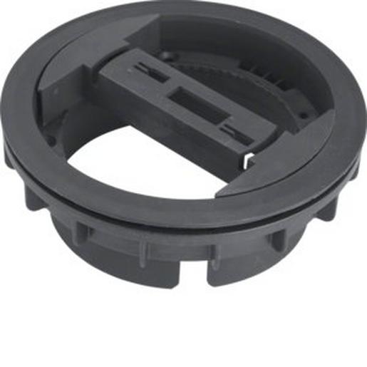 Leitungsauslass mit Rundketten-Anbindung Spannbereich <20mm aus PA tiefschwarz. Leitungsauslass als Universaleinbauteil mit Belagschutzrahmen, zur Anbindung der Rundkette, Einbauöffnung d = 112 mm, Außendurchmesser 132 mm.