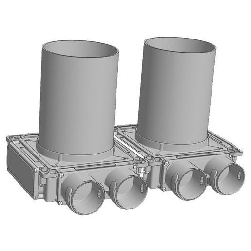 Kompaktes Luftgehäuse mit geringer Aufbauhöhe zum Einsatz als Ventilanschlussgehäuse oder als Luftverteiler mit max. 12x Anschlussstutzen NW56 sowie 1x DN125.