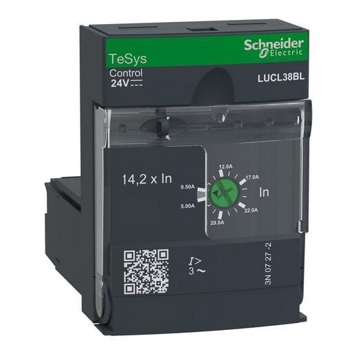 Die Steuereinheit von TeSys U mit magnetischen Schutz zum Einsetzen in das Grundgerät LUB38 zu einem kompakten Motorstarter für 3-Phasen-Motoranwendungen bis 18,5kW@400V. Er bietet Kurzschlussschutz für Motoren mit einem Nennstrom In 9,5-38A (In einstellbar über Drehregler), Überstromschutzstufe bei 14,2 x In. Anwendung: Anforderungen an den Basisschutz von Motorabgängen: Überlast und Kurzschluss. Zur Verwendung mit einer 24-V-Gleichspannung für die Steuerung des Starters (über die Steuerklemmen A1/A2 am Grundgerät). Zertifiziert bei Verwendung in Verbindung mit einem LUB-Netzteil (IEC, UL, CSA, CCC, EAC), Green Premium konform (RoHS/REACh).