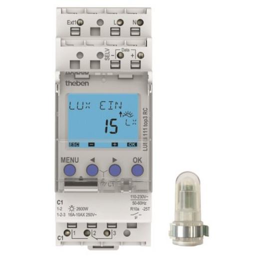 Digitaler Dämmerungsschalter/Lichtsteuergerät, 1 Kanal, Separater Aufbau-Lichtsensor (IP 55) im Lieferumfang, 1-99.000 lx, externer Eingang, Breite 2 TE, App-Programmierung möglich, Sichere Übertragung per optionalem Bluetooth Low Energy OBELISK top3, Maximale Manipulationssicherheit, Programme können nur dann von der App in die Uhr übertragen werden, wenn der Bluetooth OBELISK top3 in der Uhr steckt, 600 Watt LED-Leistung, 800 Ampere/200 Mikrosekunden Einschaltstrom, geringe Stand-by Leistung, Betriebsstundenzähler, DuoFix Steckklemmen, Gangreserve, OBELISK-Schnittstelle für PC-Programmierung