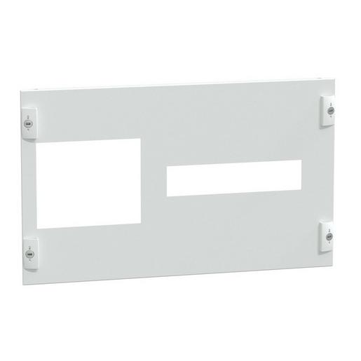PrismaSeT P. Frontplatte mit Ausschnitt für ein PowerLogic Vigilohm IM400 und drei XD301 oder ein bis zwei IFL12 in vertikaler Einbaulage, mit einer Höhe von 6 Moduleinheiten für Schaltschränke mit einer Breite von 650 mm. Pulverbeschichtet in RAL9003 struktur.