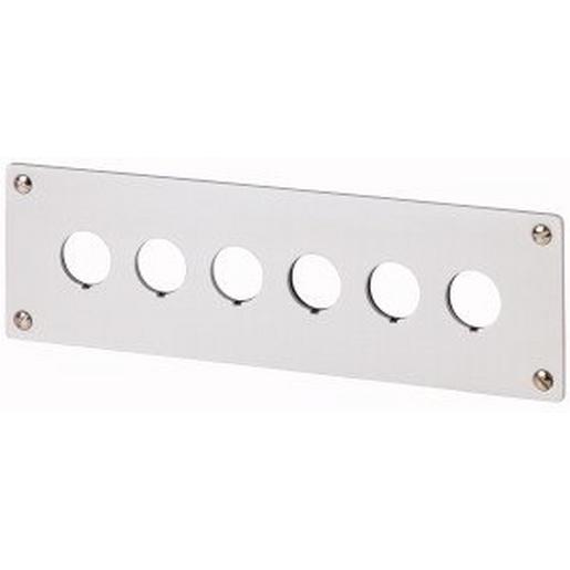 Einbauplatte, Einbaustellen: 6, Schutzart: IP40, Farbe grau, Farbe RAL-Wert: RAL 7035, Anbindung an SmartWire-DT: nein, bei senkrechter Anordnung keine Tastenzusatzschilder möglich, Schutzart gilt nur in Verbindung mit einem entsprechenden gehäuse und bei fachgerechter Montage, Aluminium hell eloxiert, einschließlich M22-XE?