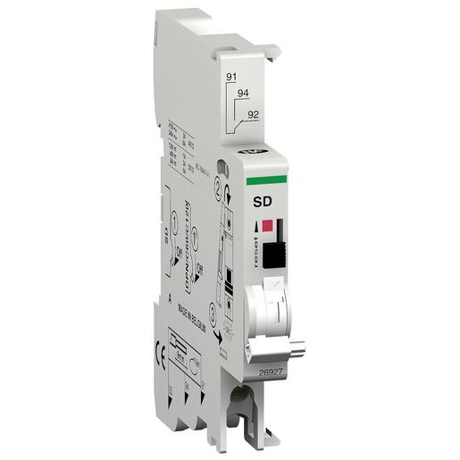 Fehlermeldeschalter SD Multi 9 OEM. Betriebsspannung (Ue) 240-415V AC / 24-130V DC, Breite 9mm, 1 Wechsler. Umschaltkontakt zur Anzeige der Position des zugehörigen Gerätes bei elektrischer Störung oder Aktivierung der Zusatzausrüstung für die Auslösung. Mit Testfunktion auf der Frontseite. Zur Fernmeldung einer Fehlerauslösung des zugehörigen Gerätes. Nicht kompatibel mit einem Fehlerstromschutzschalter GFP UL 1053, verwenden Sie einen SD+OF in der SD-Position. Der Fehlermelde-/Hilfsschalter OF+SD/OF erfüllt folgende Normen- IEC/EN 60947-5-1, EN 62019-2.