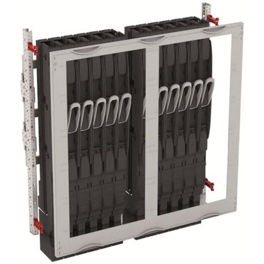 Innenausbau Modul, CombiLine, montiert im Schrank eingebaut, für Sammelschienensystem 185 mm NH-Lasttrennleisten, Rasteinheit 5 RE = 750 mm, Feldbreite 2 = 500 mm, 120 Platzeinheiten, nutzbare Breite von 400 mm, bestückt mit 8 NH-Sicherungslasttrennleisten NH00, Betriebsmittel Fabrikat: ABB, InLine II ZHBM, für Sammelschienensystem 3-polig, Ausrichtung Sammelschienen: horizontal, mit Sammelschienenhalter ZX522, Sammelschienenmittenabstand: 185 mm, für maximal 3 Cu-Schienen, (Sammelschienen müssen separat bestellt werden), Bemessungsstrom In max. 850 A, Abdeckungen aus Kunststoff, 90 Grad Druck-Drehverschluss, RAL 7035, Ausführung der Abdeckung: mit Ausschnitt, einsetzbar ab einer Schranktiefe von 275 mm, WR Montagegerüst muss separat bestellt werden