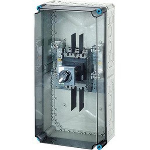 Gehäuse für den Bau von Energie-Schaltgerätekombinationen bis 630 A oder als Einzelgehäuse. Aus hochwertigem Polycarbonat schutzisoliert. Wanddurchführungen mit großen Öffnungen für die elektrische Verbindung der Gehäuse untereinander. Kabeleinführung an allen Gehäusewänden über metrische Vorprägungen oder Anbauflansche. Gehäuse zur Wandbefestigung auch über Außenlaschen oder mit Montageschienen. Gehäuse mit Leistungsschalter 250 A, 3-polig, nach IEC 60947-2. Mit PE- und N-Klemmen für Kupferleiter. Mit Überlast- und Kurzschlussauslöser. Griff des Leistungsschalters abschließbar. Deckelverschlüsse für Werkzeugbetätigung.