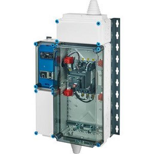 Freischaltstelle für den Anschluss von Erzeugungsanlagen an das Niederspannungsnetz sind anschlussfertige Verteilungen bis 135 kW/150 kVA entsprechend VDE-AR-N 4105 mit Kuppelschalter und NA-Schutz. Die Gehäuse aus hochwertigem Thermoplast sind schutzisoliert. Schutzart IP 54/IP 65. Sie sind für die geschützte Installation im Freien geeignet und UV-beständig. Freischaltstelle für Erzeugungsanlagen für BHKW, Photovoltaik- und Windkraftanlagen. Bemessungsleistung 135 kW/150 kVA, für 4/5-Leiter-TN-Netz. Kuppelschalter mit 1 Leistungsschalter mit Motorantrieb, 3-polig. Deckelverschlüsse für Werkzeugbetätigung, plombierbar. Wandbefestigung mit Montageschienen.