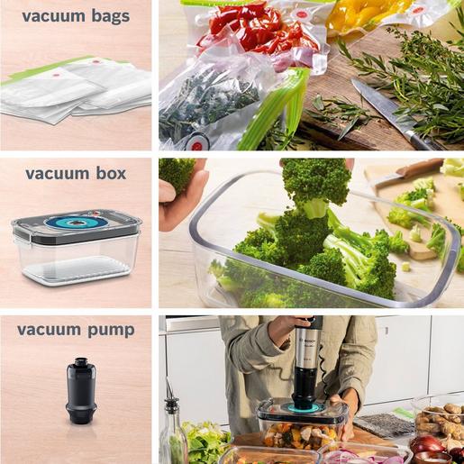 Exzellente Ergebnisse High Performance Edelstahl-Stabmixer mit leistungsstarken 1000 Watt: einfachstes Pürieren, Mixen und Zerkleinern selbst härtester Zutaten Bosch QuattroBlade Pro mit Anti-Saug-Technolgie: effizientes Mixen ohne Unterbrechungen oder Spritzer dank des 4-Klingen Messers und reduzierter Sogwirkung. Drehzahlwähler mit 12 Geschwindigkeitsstufen: optimal für jede Anwendung. Zusätzliche Turbotaste für maximale Leistung auf Knopfdruck. Komfort Optimale Handhabung durch rutschfeste Soft-Touch-Oberfläche und ergonomisches Design mit großen Tasten Bosch patentierter „Klick-Mechanismus“: ermöglicht ein hörbar leichtes Verrasten und Lösen von Mixfuß und Zubehören Einfachste Reinigung: der rostfreie Edelstahl-Mixfuß und weiteres Zubehör sind Sicherheit Bosch Sicherheitsverriegelung: Höchste Sicherheit dank patentiertem „Klickmechanismus“: Der Mixfuß rastet hörbar ein, damit sicher mit dem Motorteil verbunden. Alle Plastikteile, die mit Lebensmitteln in Berührung kommen, sind BPA frei. Vielfalt Vakuumpumpe, Vakuum-Frischhaltedose mit Deckel (1,0 l), je 3 Vakuum-Frischhaltebeutel mit 1,2 l und 3,8 l. Hochwertiger Edelstahl-Mixfuß: Verlässlich deutsche Bosch Qualität: robust und langlebig, geschmacksneutral, verfärbt nicht. Ideal für die Zubereitung von Karotten-/ oder Tomatensuppe. Transparenter Mix-/Meßbecher (600 ml) mit Skalierung und Deckel.