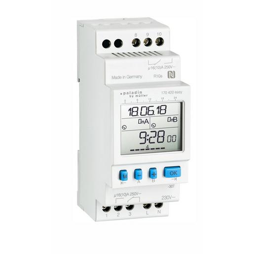 Digitale Zeitschaltuhr 2-Kanal mit Tages- und Wochenprogramm, einfaches Jahresprogramm über Zusatzschaltzeiten, 56 Speicherplätze, 10 Jahre Gangreserve, Austauschbare Batterie (CR 2032), Kürzester Schaltabstand 1 Min., Schaltleistung 16 A, Zusatzschaltzeiten EIN, AUS und Impuls nach Datum und Uhrzeit, Permanentschaltung nach Datum und Uhrzeit / Ferienprogramm, Manuelle Permanentschaltung, Manuelle Schaltungsvorwegnahme, Automatische Sommerzeitumstellung, Betriebsstunden- und Schaltimpulszähler, Einfache Handhabung, Beleuchtetes Display, Sicherheit durch PIN-Codierung, NFC-Programmierung (ISO 15693 Standard)