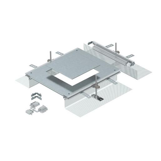 Montagefertige Kanalanbaueinheit mit einem Geräteeinbaudeckel zum Einbau einer Einbaueinheit der Nenngröße 9, bestehend aus Seitenprofilen mit angesetzter flexibler Seitenwand aus Metallgewebe, Bodenbelaganlegeprofilen, Kanaldeckel mit blind verschlossener Montageöffnung und einem Kanalendstück. Im Lieferumfang enthalten sind 3 höhennivellierbare Befestigungswinkel, 3 Estrichanker, 1 Deckelstoßunterstützung (ohne Nivelliereinheit – bitte separat bestellen) und 1 Bausatz für Winkelabzweig.