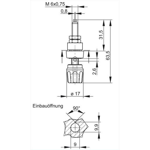 Mit Krallenrand und fest verbundenem, unverlierbarem Isolierkopf. Der Gewindebolzen mit Ø 4 mm besteht aus vernickeltem Messing und verfügt über ein Querloch mit Ø 2,6 mm zum einfachen Anklemmen von abisolierten Leitungen. Zum isolierten, verdrehsicheren Einbau in Gerätechassis und Schalttafeln bis 3,5 mm Wandstärke.