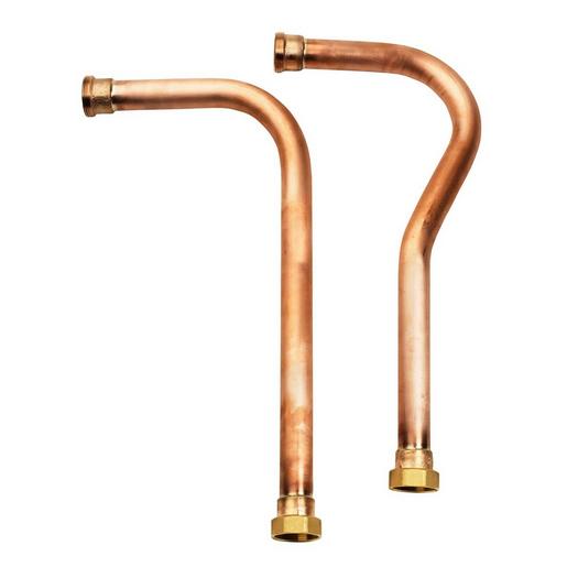 Die direkt in der Wärmepumpe verschraubbare Rohrbaugruppe besteht aus zwei speziell gebogenen und auf die Hocheffizienz Luft/Wasser-Wärmepumpe abgestimmten Rohrleitungen mit Übergangsstücken für den Heizwasseranschluss. Bei einer außenwandnahen Aufstellung ist mit diesen, seitlich aus der Wärmepumpe geführten Rohrbaugruppen (Grundrahmen Ausblasseite, rechts unterhalb des Lüfters) eine oberirdische Einführung ins Gebäude möglich (Wärmedämmung für Frostschutz erforderlich). Dadurch entfällt die, zur Einführung in Kellerräume, standardmäßig vorgesehene unterirdische Rohrleitungsführung.