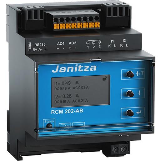 Differenzstromüberwachungsgerät RCM 202-AB Das RCM 202-AB wird mit angeschlossenen Strommesswandlern zur Messung und Überwachungvon Differenzströmen vom Typ A, B und B+ in TN- und TT-Systemen (geerdete AC-Systeme) eingesetzt.Versorgungsspannung:85 … 305 V AC (50/60Hz)- Differenzstrommessung über bis zu zwei angeschlossene Strommesswandler- Wandleranschlussüberwachung auf Drahtbruch bzw. Kurzschluss pro Kanal- Erfassung, Auswertung und Überwachung von Differenzströmen Typ A und B nach IEC 62020- Erfassung von sinusförmigen Wechselfehlerströmen mit Frequenzen bis 20 kHz (Typ B+)- Messwerte- und Extremwertespeicher mit ZeitstempelMesskanäle- Zwei Stromwandleranschlüsse (kompatibel mit allen Janitza Differenzstromwandlern)- Messbereich AC/DC: 10mA … 20AMesswertanzeige und Bedienung- zweifarbiges LED-Display (128 x 64 Pixel)- 3-Tasterbedienung- Deutsche, Englische und Spanische Benutzerführung wählbarKommunikation- RS485-Schnittstelle (Protokoll: Modbus RTU)- Kompatibel mit allen Kommunikationsfähigen Janitza Modbus Mastergeräten
