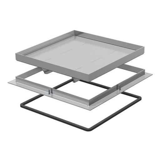 Rahmenkassette Schwerlast „blind“ für die Herstellung einer Revisionsöffnung in der UZD250-3 in trocken oder nass gepflegten Fußböden. Belastungsklasse 2 bis 20 kN. Nur für glatte Bodenbeläge im Innenbereich geeignet.
