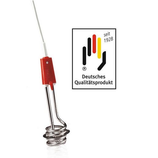 Reisetauchsieder, 230 V ~ 350 Watt, Edelstahl Rohrheizkörper, Überhitzungsschutz, Abstandhalter, 0,7m langes Anschlußkabel, in farbigem Reißverschlussetui