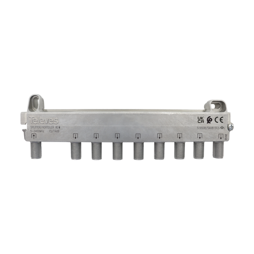 8-fach Verteiler 5-2400 MHz im Gußgehäuse mit Wandabstand und F-Anschlüssen. Eingänge und Ausgänge auf einer Seite, dadurch weniger Platzbedarf, brummentkoppelt, DC-Pass Ausgang. -> Eingang. Verteildämpfung 14dB