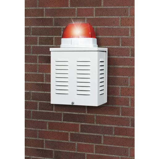 Sirene + Blitz Die Sirene mit Blitzlicht können Sie innerhalb und außerhalb Ihres Gebäudes montieren. Die Alarmsirene mit Blitzlicht ist ein Kombisignalgeber und ein entscheidende Baustein einer vollständig funktionierenden Alarmkette. Bei Alarm erzeugt die Sirene einen extrem lauten Signalton mit über 110 dB Schalldruck. Zusätzlich zur akustischen Absicherung erfolgt eine optische Alarmierung durch ein rotes, bis in weite Ferne sichtbares Xenon-Blitzlicht (Blitzfrequenz: 1,17Hz). Die Ansteuerung von Sirene und Blitzlicht ist getrennt möglich. Das wetterfeste Aluminiumgehäuse (IP 34) des Kombimelders wird durch einen Wand- und einen Deckelkontakt, sowie durch ein zusätzliches Innengitter vor Sabotage geschützt. Die Sirene mit Blitz wird extern mit 12V versorgt. Mit Xenon-Blitzlicht beträgt die maximale Stromaufnahme 750mA, ohne Blitzlicht 350mA. Schalldruck?110dB @ 1m|Blinkfrequenz?1,17Hz|Leuchtmittel?Xenon|Leuchtfarbe?Rot|Sabotageüberwachung?Ja|Spannungsversorgung?12VDC|Stromaufnahme?Max. (ohne Blitz) 340mA Max. (mit Blitz) 750mA|Gehäusematerial?Aluminium|Schutzart?IP34|Montageort?Innen- und Außenbereich|Betriebstemperatur?-25 bis +55°C|Abmessungen (BxHxT)?190x310x115 mm|Gewicht ?1850g| Sabotagealarm bei Abreißen und Öffnen|Sirene und Blitz getrennt ansteuerbar|Robuste Sirene im Aluminiumgehäuse|
