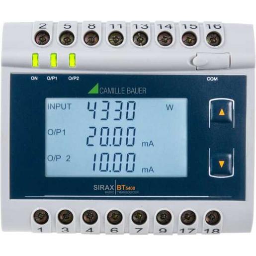 Messumformer für Leistung, Phasenwinkel und Leistungsfaktor, RS485, LCD-Display. Der SIRAX BT5400 wird zur Messung und Umwandlung von Wirkleistung, Scheinleistung, Blindleistung, Phasenwinkel und Leistungsfaktor einphasiger oder dreiphasiger AC-Systeme mit symmetrischer oder asymmetrischer Last in ein proportionales Gleichstrom- oder Gleichspannungsausgangssignal eingesetzt.. Anschlussart einphasig, oder 3-Phasen 3-Leiter gleich- oder ungleichbelastet, oder 3-Phasen 4-Leiter gleich- oder ungleichbelastet Messeingang für LeistungNennspannung bis 500 V, Nennstrom 1 / 5 A2 konfigurierbare analog Ausgänge linear oder mit Knick und einem Bereichunipolar von 0…20 mA / 4…20 mA oder 0…10 V oderbipolar von -20…0 mA oder -10…0…+10 VSchnelle Vor-Ort Programmierung durch Drucktasten oder via CB-Configurator SoftwareEinfache Gerätebedienung vor OrtKlare und gut lesbare Darstellung der Messdaten über LCD-AnzeigeFlexible Kommunikation und Fernauslesung über integrierte Modbus-RTU-SchnittstelleDIN Rail HutschienenmontageGrundgenauigkeit 0,2 %, Grundgenauigkeit Phasenwinkel, Leistungsfaktor 0,5 %.