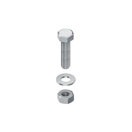 Sechskantschraube nach DIN EN ISO 4017, inklusive Sechskantmutter nach DIN EN ISO 4032 und Unterlegscheibe nach DIN EN ISO 7089. Die Festigkeitsklasse der Schraube ist auf dem Schraubenkopf eingeprägt. Speziell bei Anschlüssen, die vertikale Lasten über Reibung übertragen müssen, ist unbedingt auf das Schraubenanzugsmoment zu achten und mit dem Drehmomentenschlüssel zu überprüfen! Abmessung (ca. Maße) L : 40 mm Gewinde : M16 Festigkeitsklasse : 8.8 Schraubenanzugsmoment : 206 Nm Schlüsselweite : SW 24 Werkstoff : Stahl, galvanisch verzinkt nach DIN EN ISO 4042, blaupassiviert