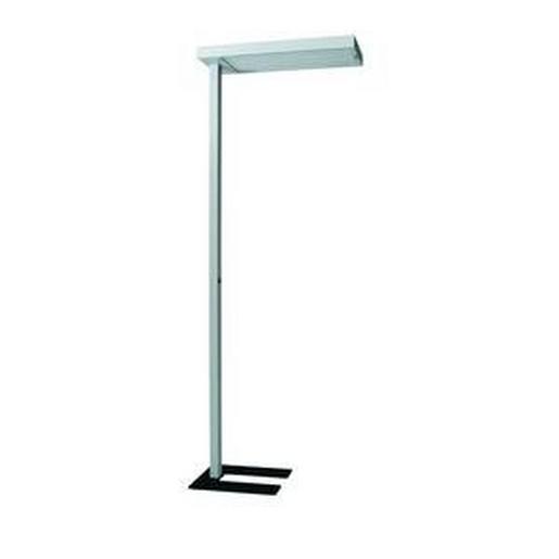 Stehleuchte direkt-indirekt strahlend. Leuchtenkopf aus Stahlblech, längs zum Stativ montiert, weiß (ähnlich RAL9016) bzw. silber (-SI, ähnlich RAL9006) pulverbeschichtet. Direktanteil mit Mikroprismenscheibe MPS, Prismen außenliegend, aus UV-beständigem PMMA. Indirektanteil mit klarer Abdeckscheibe aus UV-beständigem PMMA. Bestückt mit RIDI-LED-Modulen. Stativ aus stranggepresstem Aluminium mit geschlossenem Querschnitt für optimale Stabilität. Stativfuß aus Stahlblech, schwarz pulverbeschichtet, mit höhenverstellbaren Leuchtenfüßen und Aussparung für Schreibtischfüße. Direkt-indirekt strahlend, gemeinsam schalt- und dimmbar. Bewegungs- und Lichtsensor in Leuchtenkopf eingebaut.