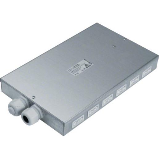 Sammelpunkt Energie 12 Ausgangsbuchsen 3-polig Stecksystem Wago reinweiß. Vorverdrahteter Sammelpunkt als dezentraler Verteiler zum Anschluss von Energieleitungen mit Anschlussstecker (WAGO- oder Wieland-Stecktechnik) mit maximal 2 Zuleitungen. Sammelpunkt bestehend aus Stahlblech-Gehäuse mit zwölf 3-poligen Anschlussbuchsen (Wechselstromabgänge) und 2 Kabelverschraubungen M25. Gehäuse ist im Hohlraum- oder Doppelboden einsetzbar. Hinweis: Zulässige Strombelastungen und Leitungslängen beachten.