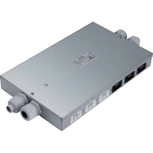 Sammelpunkt Energie 2×6 Ausgangsbuchsen 3-polig Stecksystem Wago 6x weiß/schwarz. Vorverdrahteter Sammelpunkt als dezentraler Verteiler zum Anschluss von Energieleitungen mit Anschlussstecker (WAGO- oder Wieland-Stecktechnik) und mit maximal 4 Zuleitungen. Sammelpunkt bestehend aus Stahlblech-Gehäuse mit zwölf 3-poligen Anschlussbuchsen (Wechselstromabgänge) und 4 Kabelverschraubungen M25. Gehäuse ist im Hohlraum- oder Doppelboden einsetzbar. Hinweis: Zulässige Strombelastungen und Leitungslängen beachten.