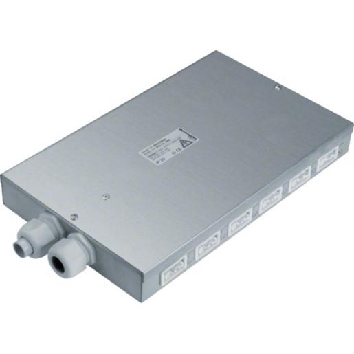 Sammelpunkt Energie 12 Ausgangsbuchsen 3-polig Stecksystem Wieland reinweiß. Vorverdrahteter Sammelpunkt als dezentraler Verteiler zum Anschluss von Energieleitungen mit Anschlussstecker (WAGO- oder Wieland-Stecktechnik) mit maximal 2 Zuleitungen. Sammelpunkt bestehend aus Stahlblech-Gehäuse mit zwölf 3-poligen Anschlussbuchsen (Wechselstromabgänge) und 2 Kabelverschraubungen M25. Gehäuse ist im Hohlraum- oder Doppelboden einsetzbar. Hinweis: Zulässige Strombelastungen und Leitungslängen beachten.