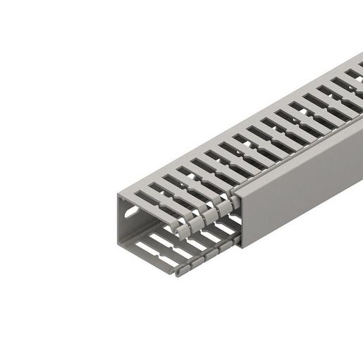 Verdrahtungskanal mit Deckel und zweireihiger Befestigungslochung im Kanalboden, auf der Unterseite mit doppelseitigem Klebeband zur besseren Fixierung versehen, die Stege sind ohne Werkzeug ausbrechbar, halogenhaltig. VDE zertifiziert! Abmessungen H x B (ca. Maße) : 100 x 100 mm Schlitzbreite : 6 mm verjüngt auf 2 mm Stegbreite : 6,5 mm einreihige Bodenlochung : 6,5 x 14 und 4,5 x 8 mm Bodenlochabstand : 25 mm Reihenabstand : 50 mm Lieferlänge L : 2000 mm Nutzbarer Querschnitt : 9119 mm² Einsatztemperaturbereich : -5° bis 60°C Werkstoff : Polyvinylchlorid, hart (PVC-hart) Farbton : steingrau RAL : 7030 (ähnlich)
