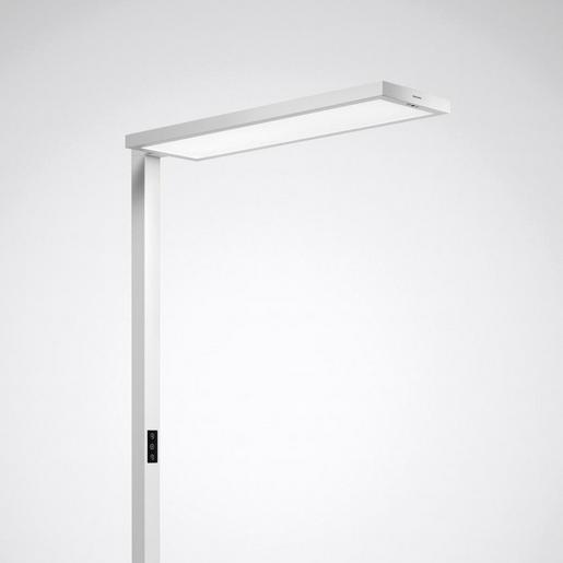LED-Standleuchte mit direkt und indirekter Lichtstromverteilung, dimmbar. Mit integriertem Passiv-Infrarot-Präsenzmelder und Tageslichtsensor. Eine eingeschaltete Leuchte reduziert die Lichtleistung um 70%, wenn innerhalb eines Zeitraums von 30 Minuten keine Bewegung erfasst wurde. Nach weiteren 30 Minuten ohne Bewegungserkennung wird die Leuchte ausgeschaltet. Der Tageslichtsensor ermöglicht bei Aktivierung ein konstantes Helligkeitsniveau im Umfeld der Leuchte. Der Helligkeits-Referenzwert kann mittels Taster verändert und abgespeichert werden. Ein DIP-Schalter ermöglicht die Einstellung und Kombination der Lichtmanagement-Betriebsarten (Bewegungs-Sensor Ein/Aus, Tageslichtsensor Ein/Aus). Optisches System bestehend aus einer prismatischen PMMA-Abdeckscheibe für den Direktanteil und einer klaren PMMA-Abdeckung für den Indirektanteil. Mit symmetrisch begrenzt breit strahlender Lichtstärkeverteilung. Blendungsbewertung nach UGR-Einstufung (EN 12464-1) < 19. Leuchtenlichtstrom und Lichtfarbe fest eingestellt. Bemessungslichtstrom 13500 lm, Bemessungsleistung 95 W, maximale Leuchten-Lichtausbeute 142 lm/W. Lichtfarbe neutralweiß, ähnlichste Farbtemperatur (CCT) 4000 K, allgemeiner Farbwiedergabeindex (CRI) Ra > 80. Farborttoleranz (initial MacAdam) ? 3 SDCM. Mittlere Bemessungslebensdauer L80(tq 25 °C) = 50.000 h. Die Lichtquelle ist entsprechend der Ökodesign-Anforderungen (VO (EU) 2019/2020) austauschbar. Leuchtenkörper aus Aluminium. Bestehend aus Leuchtenkopf, Standprofil und Standfuß. Oberfläche weiß beschichtet (RAL 9016). Leuchtenkopf und Mast in rechteckiger Ausführung. Der Standfuß ist u-förmig. Maße Leuchtenkopf: 835 mm x 300 mm, Leuchtenhöhe: 1960 mm. Schutzklasse (EN 61140): I, Schutzart (DIN EN 60529): IP20, Stoßfestigkeitsgrad nach IEC 62262: IK02, Prüftemperatur Glühdrahttest gemäß IEC 60695-2-11: 650 °C. Gewicht: 14,7 kg. Mit elektronischem Betriebsgerät, dimmbar (integriert) Leuchte mittels Tastfunktion über DALI-Steuerklemmen schalt- und dimmbar (Touch DIM). Das Betriebsgerät ist entsprechend der Ökodesign-Anforderungen (VO (EU) 2019/2020) austauschbar. Die Bedienung nach dem Touch-Dimm-Prinzip erfolgt über einen im Leuchtenmast plan zur Mastoberfläche eingelassenen Tastsensor. Direkt- und Indirektanteil getrennt dimmbar. Das Produkt erfüllt die grundlegenden Anforderungen der anwendbaren EU-Richtlinien und des Produktsicherheitsgesetzes und trägt die CE-Kennzeichnung.