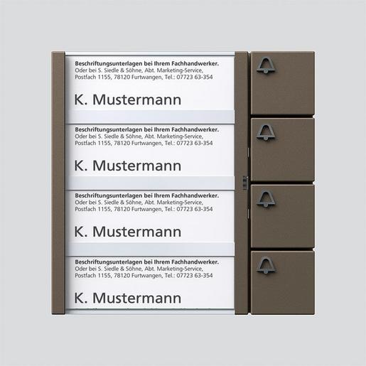 Tasten-Modul mit Namensschildtasche, 4 Namensschildern und 4 separaten Ruftasten mit Glockensymbol.