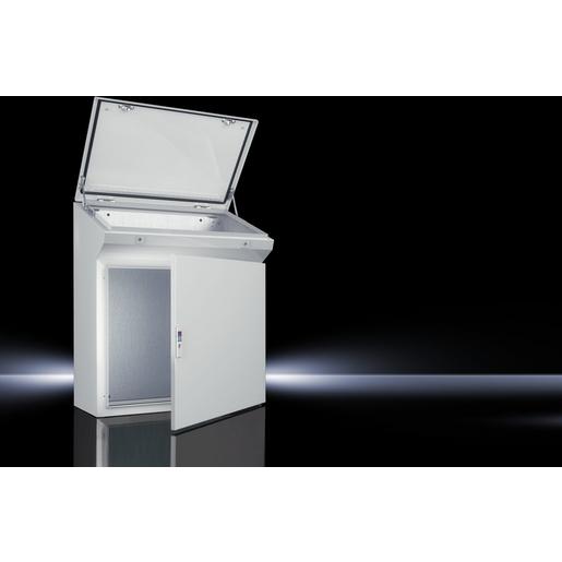 Standpulte TP, Farbe: grau, Lieferumfang: Gehäuse, hinten und seitlich geschlossen Tür bzw. Doppeltür vorne, mit Stangenverschluss Montageplatte Deckel hinten scharniert, 2 Aufsteller mit automatischer Verriegelung. Entriegelung links automatisch, rechts manuell Boden offen für individuelle Kabeleinführung, Beschreibung: Standpulte TP, montagefertige Einheit mit hoher Schutzart IP 55 in vier verschiedenen Breiten. Werkzeuglose Montage des Deckels durch Deckelaufsteller. Kompatibilität zum TS 8 Systemzubehör, wie z. B. Sockel und Kabeleinführungshüllen., Pult-Systeme für Ergonomie und Funktionalität an der Schnittstelle Mensch/Maschine.