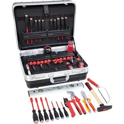 Bestückung (isolierte Werkzeuge VDE-1000V gemäß der Norm IEC 60900): VDE-Elektrikerschraubendreher 3 x 100, VDE-Elektrikerschraubendreher 4 x 100 – SLIM, VDE-Elektrikerschraubendreher 5,5 x 125 – SLIM, VDE-Elektrikerschraubendreher 6,5 x 125 – SLIM, VDE-Elektrikerschraubendreher PH1 – SLIM, VDE-Elektrikerschraubendreher PH2 – SLIM, VDE-Elektrikerschraubendreher PZ1 – SLIM, VDE-Elektrikerschraubendreher PZ2 – SLIM, VDE-Elektriker Plus/Minus – Schraubendreher PZ1 – SLIM, VDE-Elektriker Plus/Minus – Schraubendreher PZ2 – SLIM, VDE-Torx-Schraubendreher T10 x 60, VDE-Torx-Schraubendreher T15 x 75, VDE-Torx-Schraubendreher T20 x 75, VDE- Steckschlüssel -Schraubendreher SW5,5 x 125, VDE- Steckschlüssel-Schraubendreher SW7 x 126, VDE- Steckschlüssel-Schraubendreher SW8 x 127, VDE- Steckschlüssel-Schraubendreher SW10 x 128, VDE-Elektriker Plus/Minus – Schraubendreher PZ1 – SLIM, VDE-Elektriker Plus/Minus – Schraubendreher PZ2 – SLIM, VDE 2komp. Flachrundzange 200 mm, VDE 2komp. Flachrundzange gebogen 200 mm, VDE 2komp. Rundzange 160 mm, VDE 2komp. Kombizange 180 mm, VDE 2komp. Abisolierzange 160 mm, VDE 2komp. Wasserpumpenzange 240 mm, Kabelmesser Rundklinge mit integriertem Klingenschutz, Kraftseitenschneider 200 mm. Bestückung (nicht isolierte Werkzeuge): Kabelschneiderschere + Safetybox, Sechskant Stiftschlüsselsatz Klapphalter 7teilig, Kontaktloser, handlicher Spannungstester 1000V, PUK Taschensäge 150 mm, Schlosserhammer Holzstiel 300 g, Alu-Wasserwaage 400 mm, Ersatzklinge Kabelmesser AV3920, Schaltschrankschlüssel, Massband 3 x 16 mm, Bit-Sortiment-BOX, Sicherheitsbrille