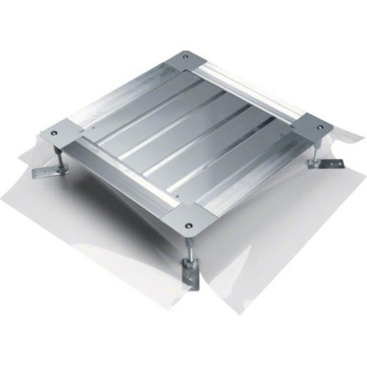 Universal-Bodendose mit Haltepratzen Größe 3 498x498x(120-170)mm. Universal-Bodendose nach DIN EN 50085-1 und DIN EN 50085-2-2 geeignet für alle Kanalbreiten bis Nennmaß, mit flexibler Folienschalung, Haltepratzen, Montageschutzdeckel und innenliegender stufenloser Höhennivellierung, akkustisch entkoppelt, Rissminimierung des Estrichs im Einbaubereich durch bewegliche Lagerung.