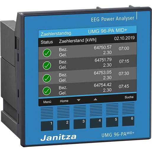Energiemessgerät UMG 96-PA MID+MID zertifiziert Zählerstandsgang zertifiziert nach PTB-A 50.7mit Uhr, Batterie und Messdatenspeicher 2 Jahre manipulationssicherer Messdatenspeicher für ZählerstandsgangFronttafeleinbaugerät, 96 x 96 x 86 mm (BxHxT) Versorgungsspannung: 90 V – 277 V (50/60) Hz oder 90 V – 250 V DCInstallationskategorie: 300 V CAT IIIMessung in TN- und TT-NetzenMessung von Oberschwingungen bis zur 40.Wirkarbeit Klasse 0,2SEU-Baumusterprüfbescheinigung VDE-40048947Geprüft nach EN 50470-1, EN 50470-3, CLC TR 50579Eingangsspannungsbereich: 3 x 57/100 bis 3 x 230/400 VGenauigkeitsklasse B nach EN 50470-1 Impulswertigkeit der S0-Schnittstelle: ohne Wandler 10000 Imp/kWh automatische Anpassung der Pulswertigkeit bei Verwendung von Messwandlern Der 1. digitale Ausgang ist als S0-Schnittstelle festgelegt für bezogene und gelieferte Wirkenergie.Inkl. Zählerstandsgangmessung3 SpannungsmesseingängeMesskategorie: 600 V CAT III Messung in 3-Phasen 4-Leitersystemen bis 417 V/720 V (+-10%) nach IEC Messung in 1-Phasen 2-Leitersystemen bis 480 V (+-10%)3 StrommesseingängeMesskategorie: 300V CAT II Nennstrom 5A/2A/1A einstellbar (MID-konform) Strommessbereich: 5 mA… 6 AAuflösung: 0,1 mA Peripherie:je 3x Digitale Eingänge und Ausgänge (einer ist festgelegt)1x Analog Ausgang 1x RS485 (Modbus RTU) Zubehör (inklusiv):33.03.375 Installationsanleitung inkl. Sicherheitshinweise und ?Software-GridVis“ Schnelleinstieg29.01.092 Klemmenabdeckung Versorgung29.01.093 Klemmabdeckung Messung29.01.065 Silikon-Dichtung 96 x 9652.22.251 Befestigungssatz 52.00.008 RS485-Abschlusswiderstand 120 Ohm