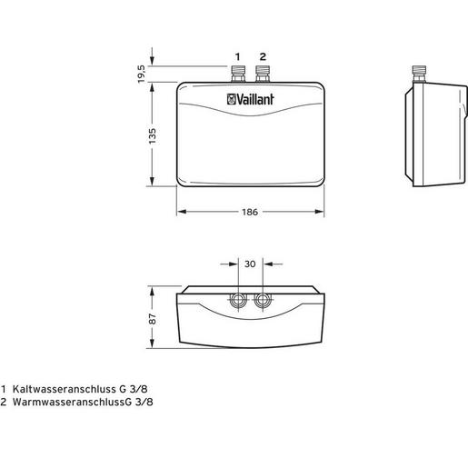 miniVED Niederdruck Elektro-Durchlauferhitzer hydraulisch Produktvorteile – Druckloser, hydraulischer mini- Durchlauferhitzer (Untertischgerät) – Effiziente dezentrale Warmwasserbe- reitung: bis zu 65 % Energie- und Wasserersparnis gegenüber Elektro- Warmwasserspeichern – Schnelle Warmwasserbereitung bei begrenztem Warmwasservolumen (Anwendung Einzel-Handwaschbecken, nicht geeignet für die Küchenspüle) – Regulierung der Wassermenge von Außen zugänglich Ausstattung – Hochwertiges Blankdraht-Heizsystem mit Differenzdruckschalter – Wartungsfreundliche Heizpatrone – Spar-Wasserstrahlregler – Anschlussleitung und Schukostecker – UV-lichtbeständige Gerätehaube (kein vergilben durch UV-Einstrahlung) Nennleistung 3,5 kW Netzspannung 1/PE 230 V/50 Hz Warmwasserdauerleistung 2 l/min Kalt-/Warmwasseranschluss R 3/8 Schutzart IP 25 Höhe/Breite/Tiefe 135/186/87 mm Gewicht 1,2 kg VAILLANT miniVED H 3/2 N 0010018600 Armatur 302595 Warmwasserbereitungs Energieeffizienzklasse A (Spektrum A+ bis F)