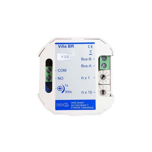 Multifunktions-Busrelais Ausgang für das Villa 2-Draht System, einstellbar per Adressierung entweder zur Ansteuerung durch Klingeltasten (z.B. für externe Läutwerke) oder zur Ansteuerung durch die Türöffnertaste oder Funktionstaste am Monitor (z.B. für Licht an), potentialfreier Ausgangs-Kontakt, Belastbarkeit 30 V DC / 3 A oder 250 V AC / 0,5 A, Zeitverzögerung: 1 – 300 Sek., Abmessungen: 49 x 51 x 22 mm, Schutzart IP 20