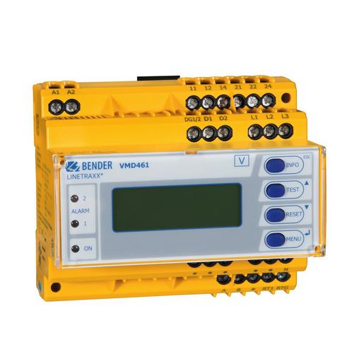 Das multifunktionale Spannungsüberwachungsrelais VMD461 überwacht Frequenzen, Unter- und Überspannungen in DC-, AC- und 3(N)AC-Systemen. Die Strang- und/oder Außenleiterspannungen werden als Effektivwert gemessen und permanent auf dem Gerätedisplay angezeigt. Der zum Schalten der Alarmrelais führende Messwert wird gespeichert.